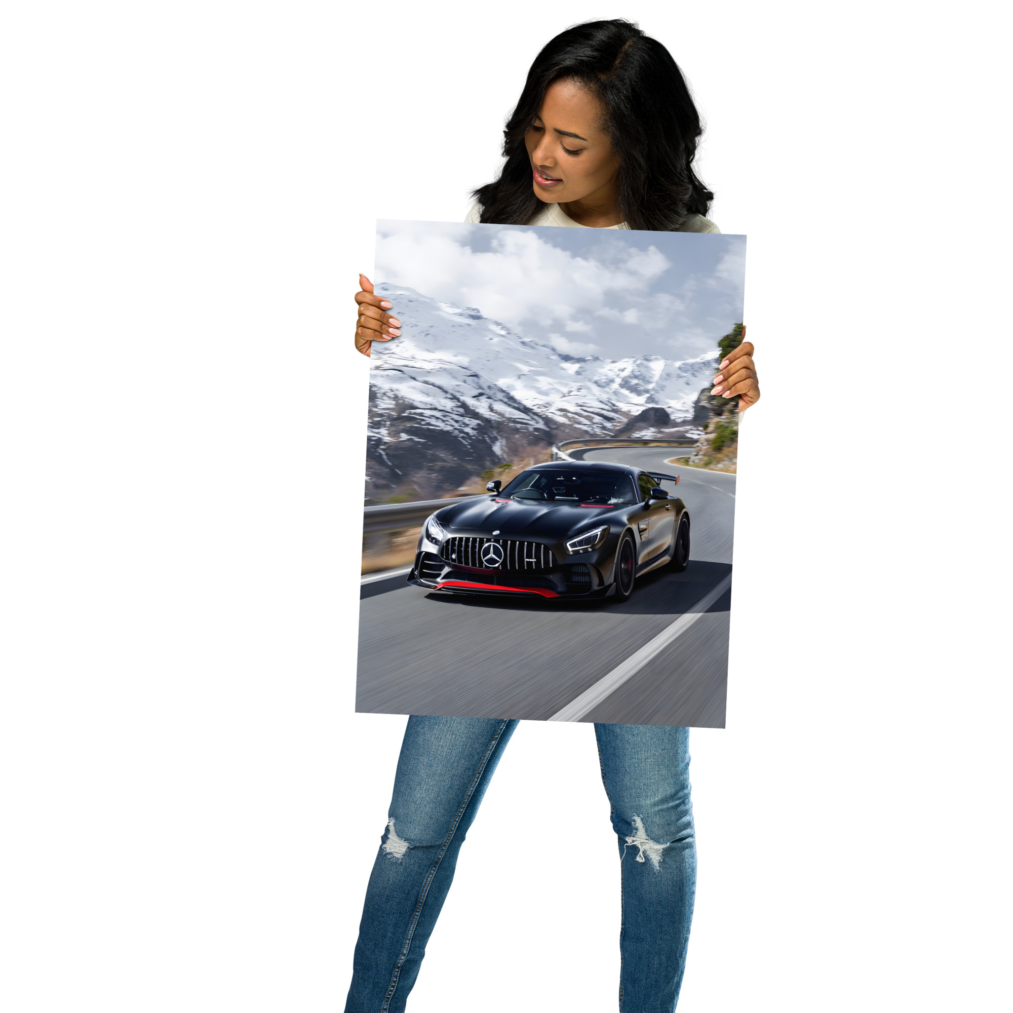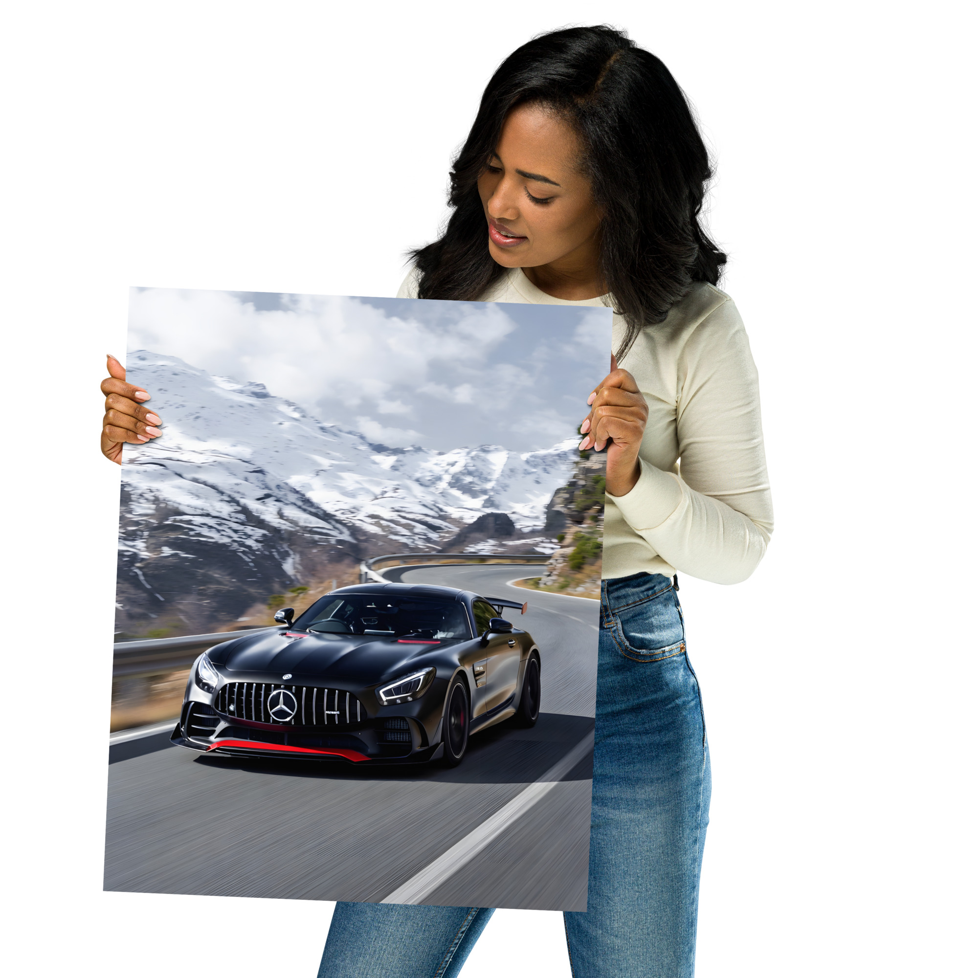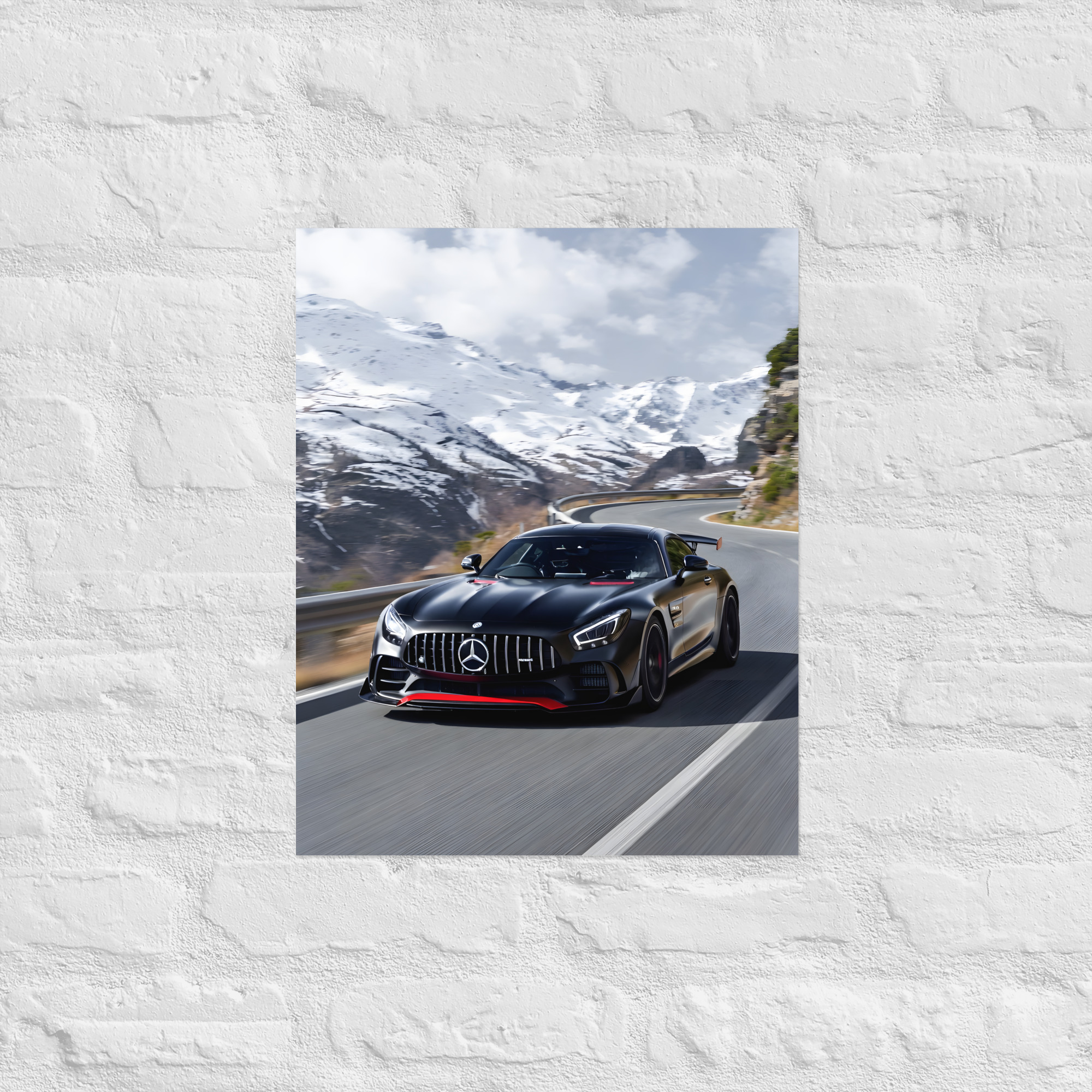 Conquer the highest roads with this breath taking black performance GT alpine pass front view matte poster! A stealth-black predator with aggressive aero, red accents, and glowing LED eyes charges through a snow-covered mountain pass, the road snaking dramatically between towering peaks under a crisp winter sky. This original artwork captures raw power meeting pure alpine beauty in cinematic style - perfect for garages, modern offices, winter cabins, or any space that lives for high-altitude speed.Printed on premium Enhanced Matte Paper, every detail - from carbon texture to snow-capped ridges - is rendered with razor-sharp clarity and a velvety, glare-free finish that shines in any light.