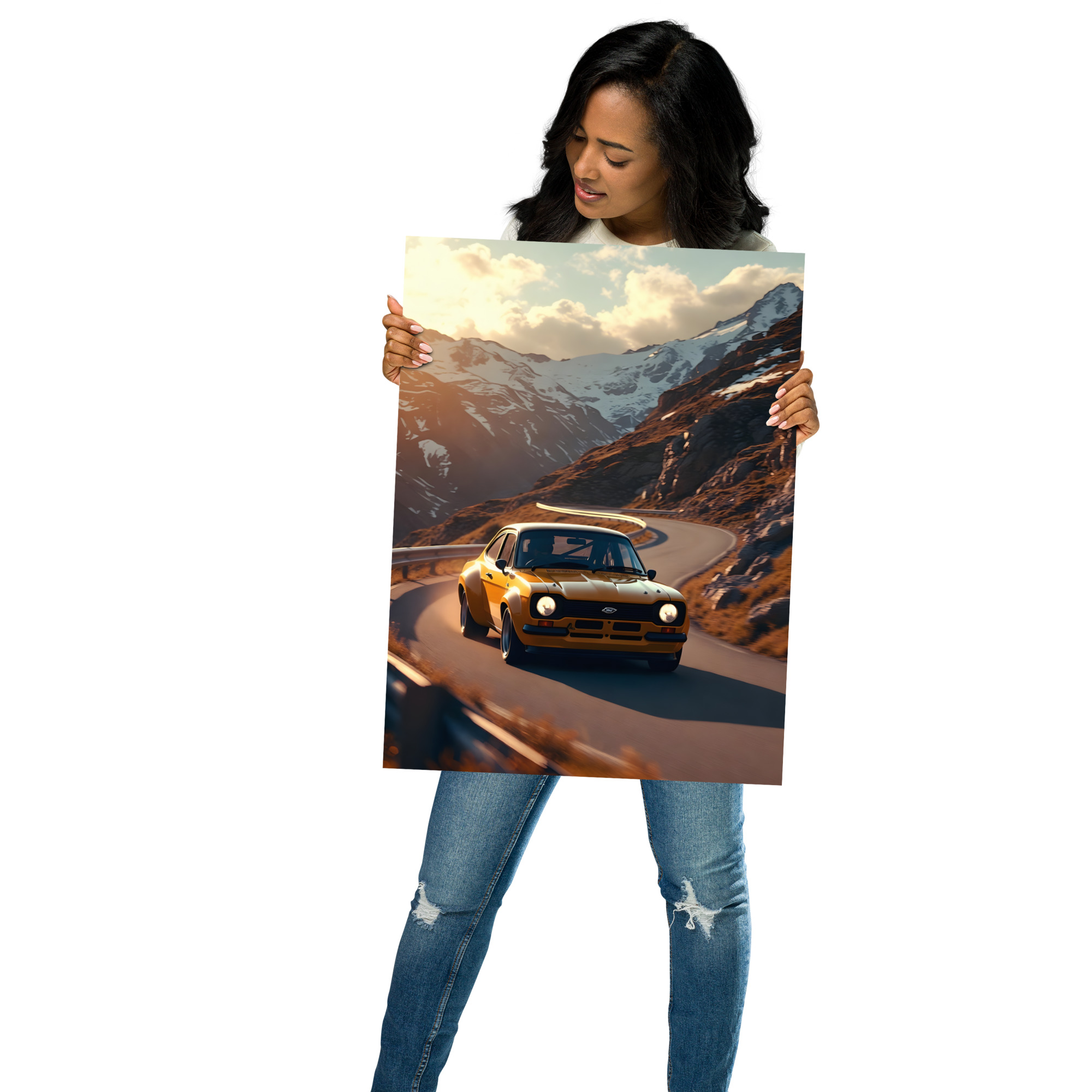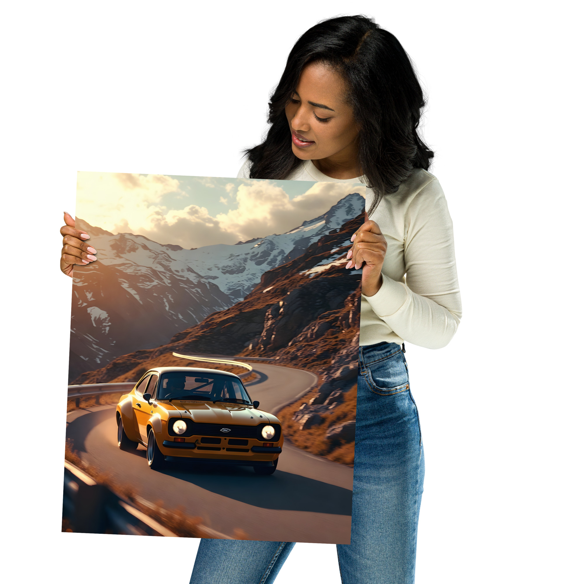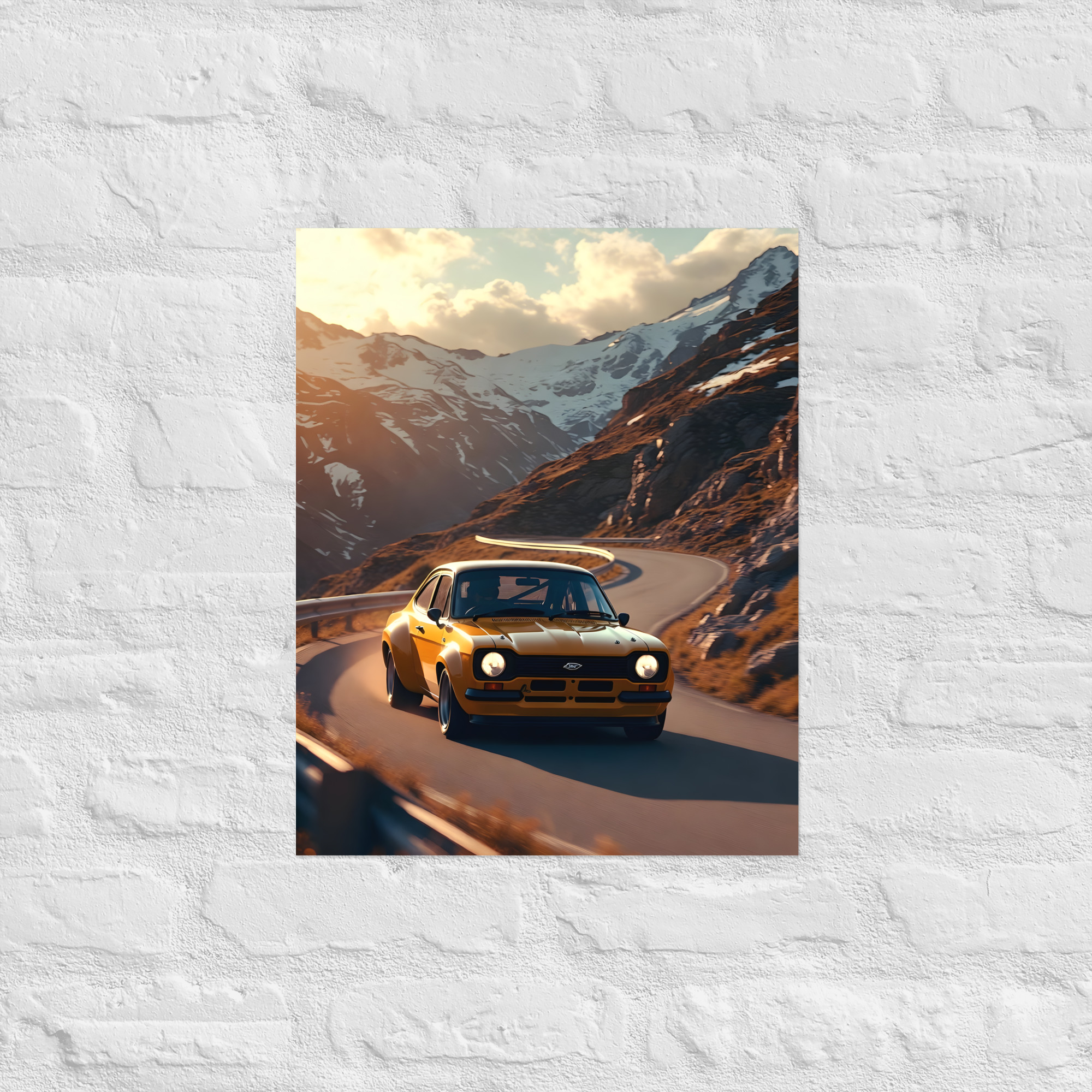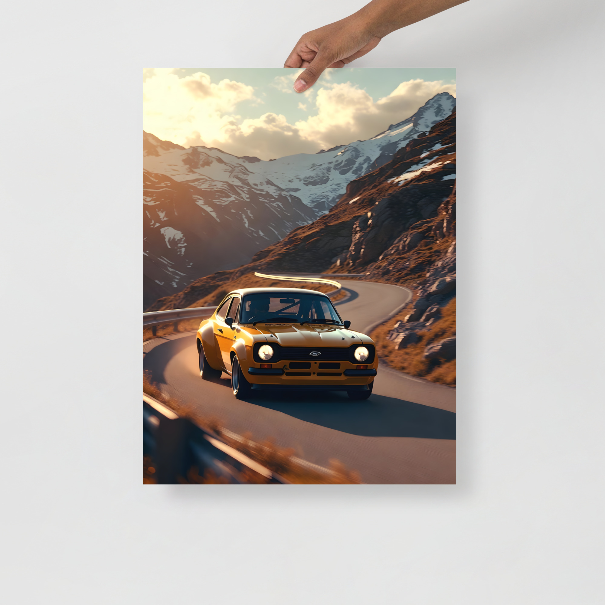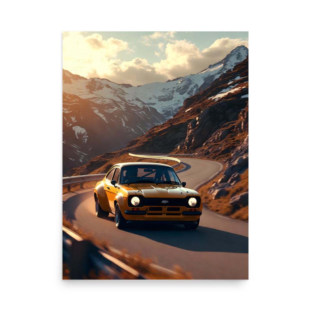 Master the mountain with this breath taking classic rally coupe alpine hairpin front view matte poster! A golden-yellow rally legend with flared arches, round headlights blazing, and aggressive stance attacks a dramatic snow-capped Alpine pass at sunrise, the road snaking through sheer cliffs bathed in warm golden light. This original artwork captures pure 70s rally spirit conquering one of the world's most iconic mountain roads - perfect for garages, cabins, man caves, or any space that lives for epic driving adventures.