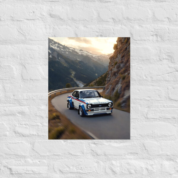 Feel the golden-hour magic of pure rally heritage! This breath taking classic rally coupe alpine sunset hairpin matte poster captures a white-blue rally legend attacking a dramatic mountain pass at sunset, flared arches gripping the asphalt, round headlights blazing, and snow-capped peaks glowing behind endless pine forests. This original artwork immortalizes 70s-80s rally spirit conquering one of the world's most iconic alpine roads - perfect for garages, cabins, man caves, or any wall that lives for epic hairpins and turbocharged history.
