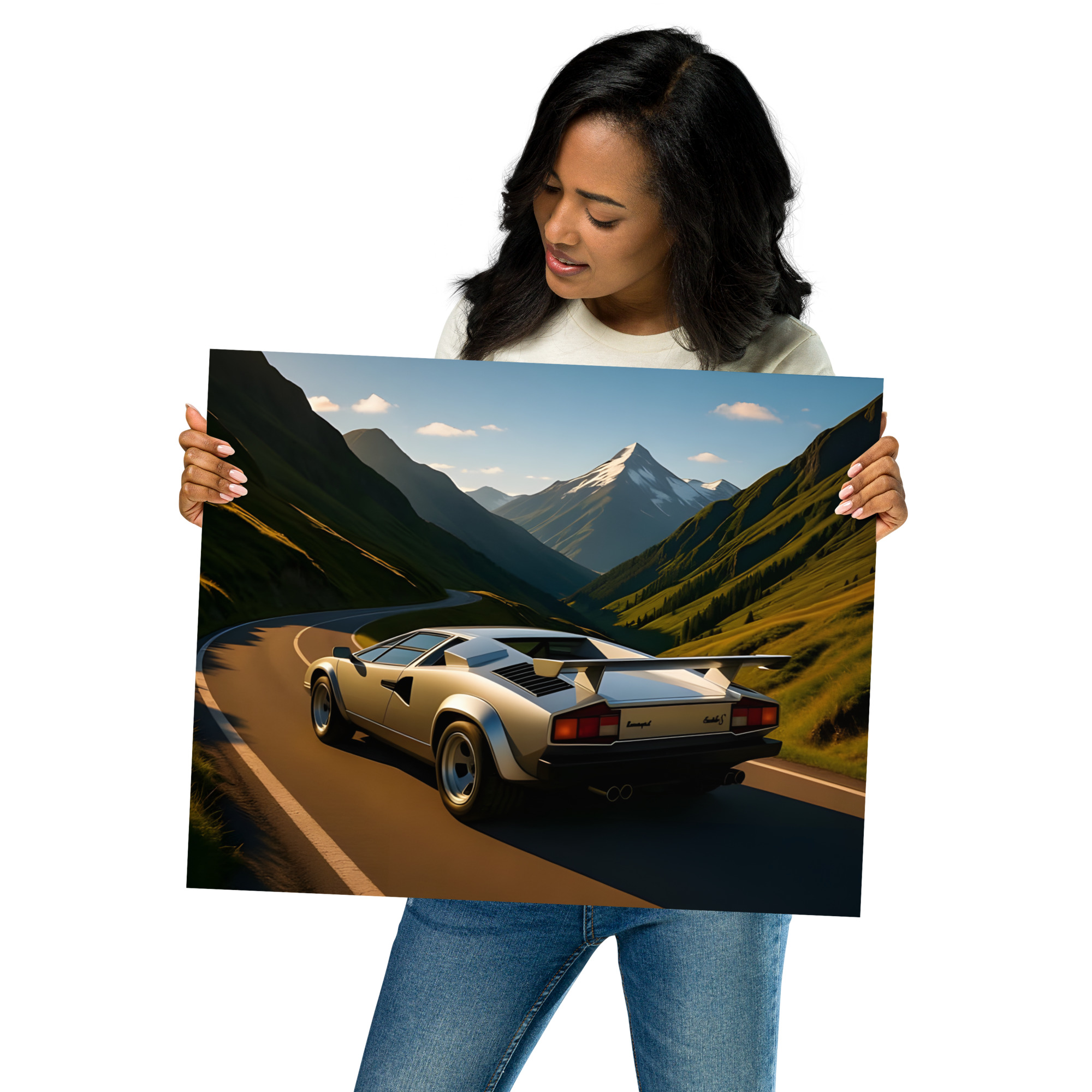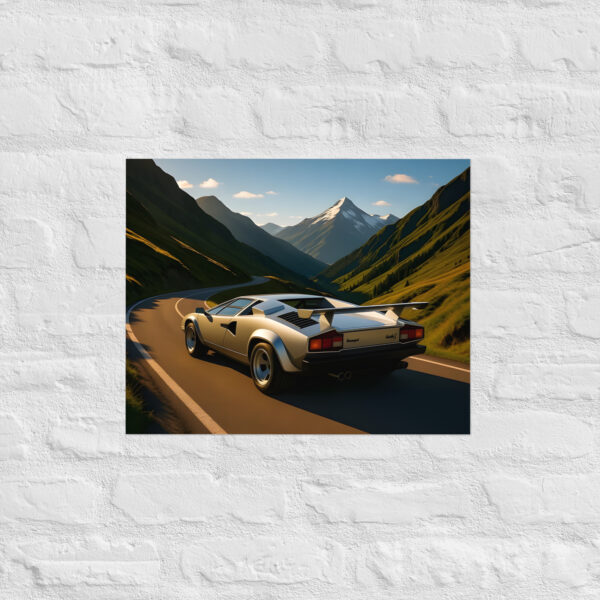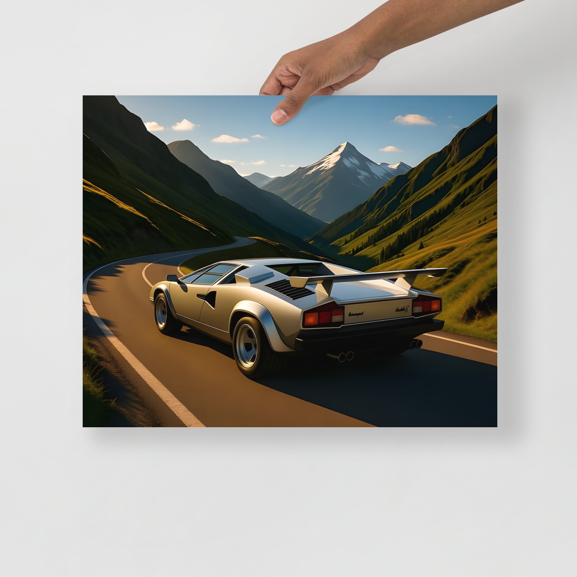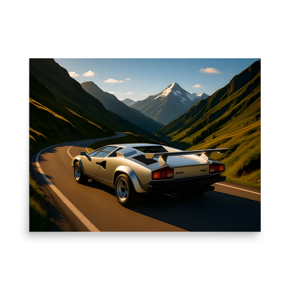 Disappear into 80s supercar paradise with this mesmerizing classic wedge supercar alpine valley rear view matte poster! The silver legend storms a perfect mountain ribbon at golden hour, its iconic rear wing and quad exhausts blazing while snow-capped peaks tower over endless emerald slopes and sweeping hairpins. This original artwork immortalizes wedge-shaped performance carving through one of the world's most beautiful passes in pure analogue glory. Exclusive to the Cars Scenic collection-where automotive icons own the planet's most dramatic roads. Printed on premium Enhanced Matte Paper, it delivers cinematic golden light, deep shadows, and razor-sharp reflections with a velvety, glare-free finish that turns any wall into an alpine escape. Choose your vanishing-point size: 11"×14", 8"×10", 16"×20", 12"×18", 18"×24", A2 (16.5"×23.3"). Frame it brushed aluminium, float-mount it clean, or hang it raw-your valley, your rules.Each order is produced fresh with eco-conscious precision for flawless quality and zero waste. Worldwide shipping in 2-5 days drops freedom at your door. The ultimate gift for 80s supercar dreamers, alpine adventurers, or anyone who believes the journey should be this dramatic.