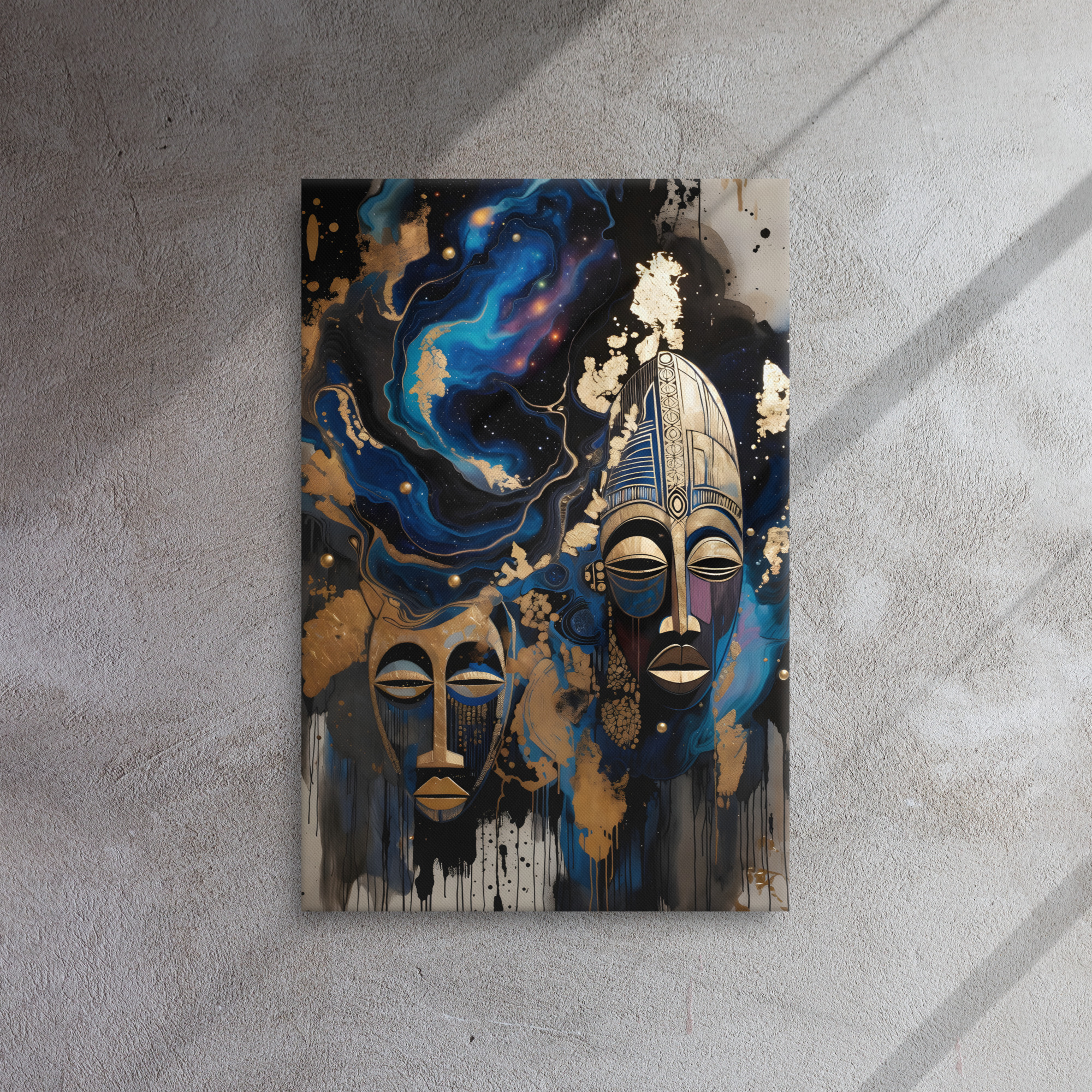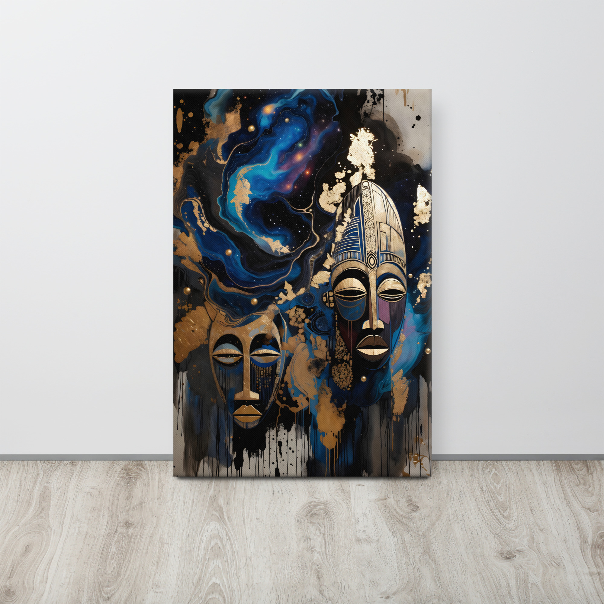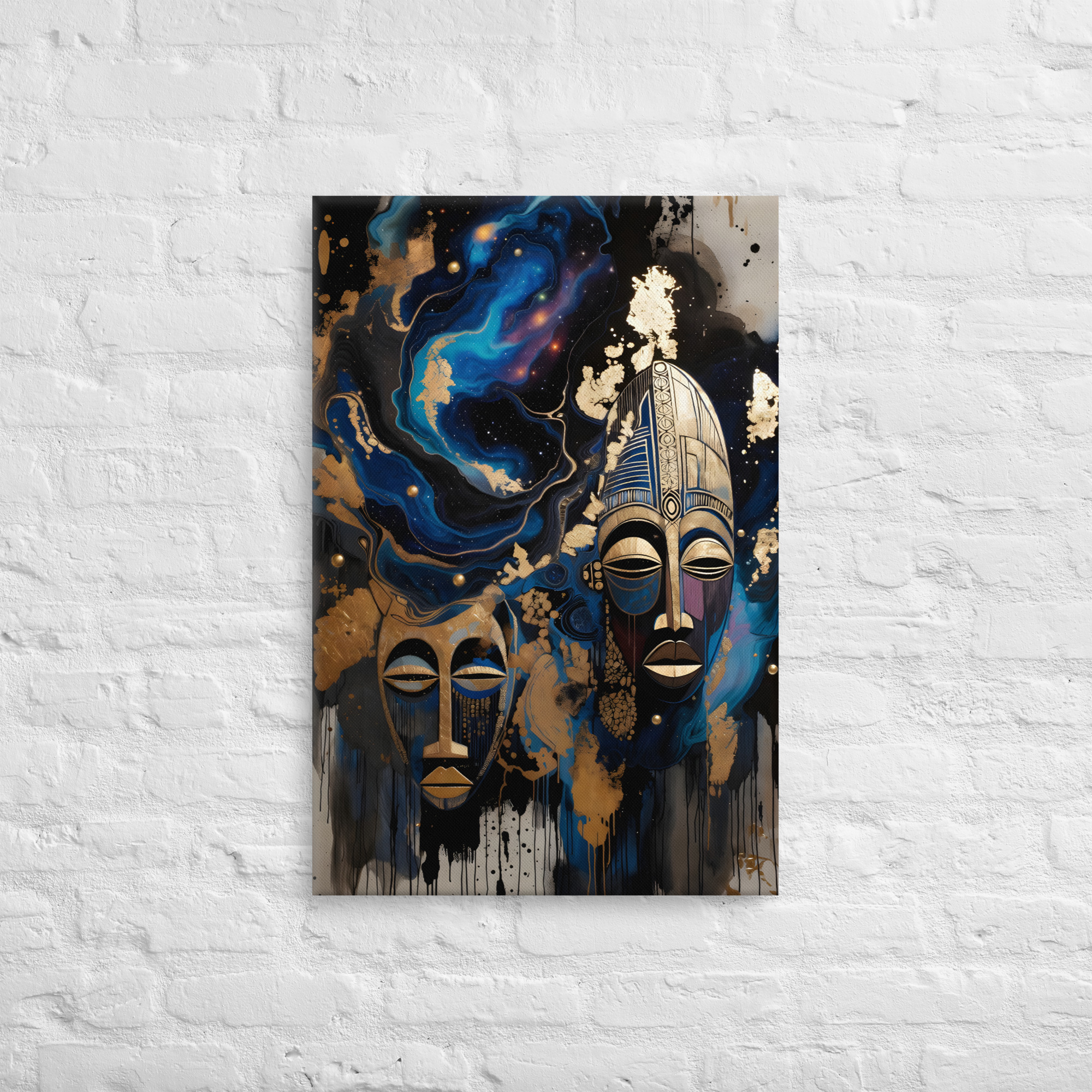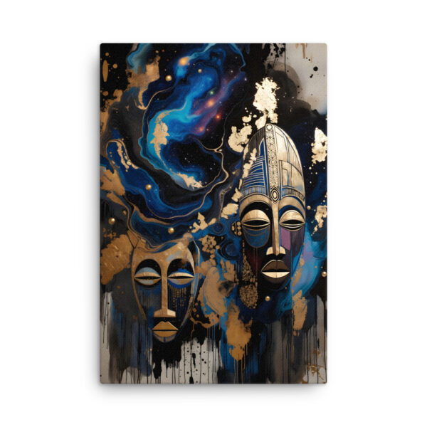 Step into the mystical with this powerful Cosmic African Tribal Masks canvas print. Two intricately carved golden tribal masks float against a swirling deep-space galaxy of electric blues, purples, and molten gold leaf splashes - fusing ancient African heritage with the infinite beauty of the cosmos. This luxurious, spiritual statement piece is perfect for modern living rooms, meditation spaces, offices, or boho-chic interiors. Printed with rich, fade-resistant inks on premium artist-grade canvas. Gallery-wrapped, ready to hang, available in 12×16, 16×20, or 20×30 inches.Key Features: