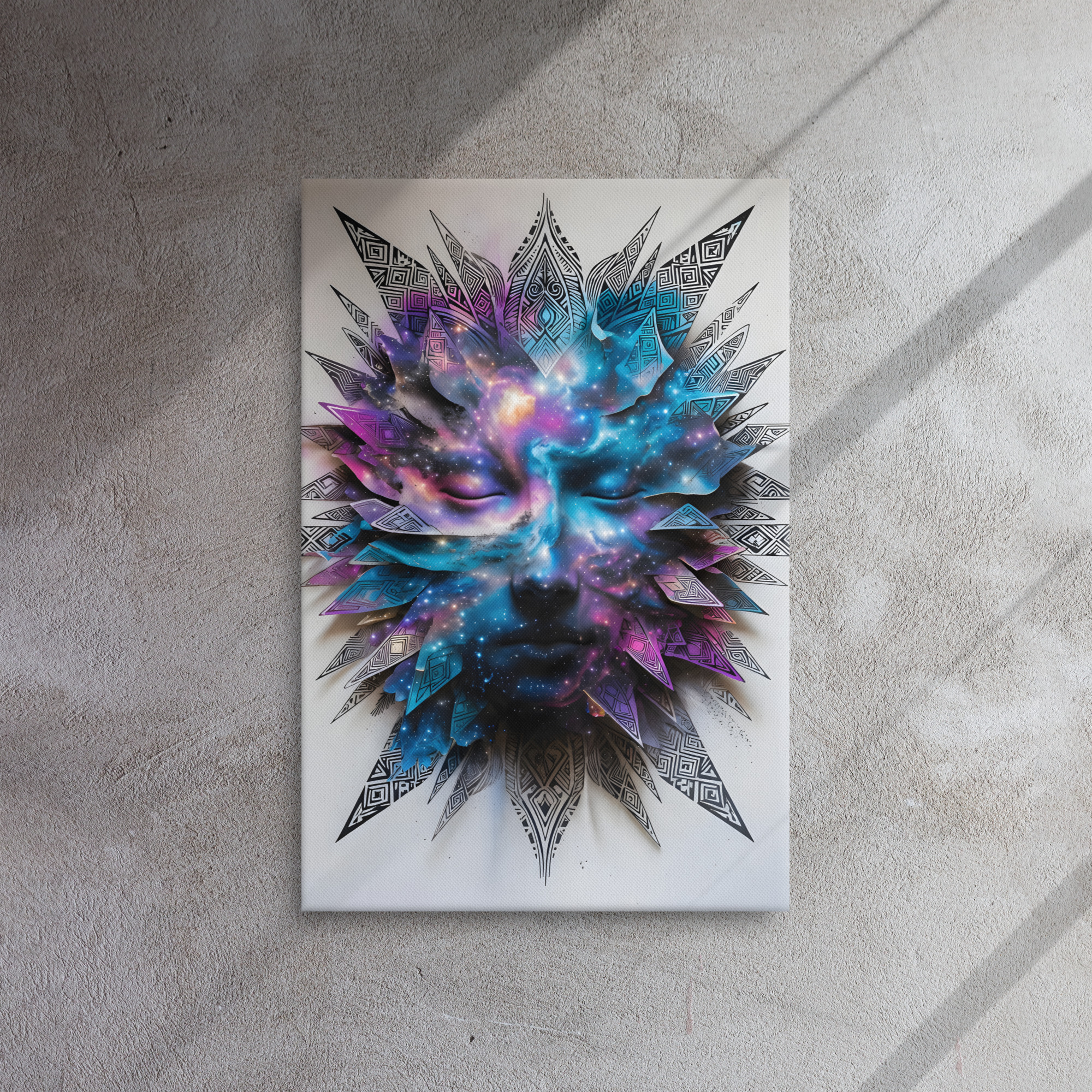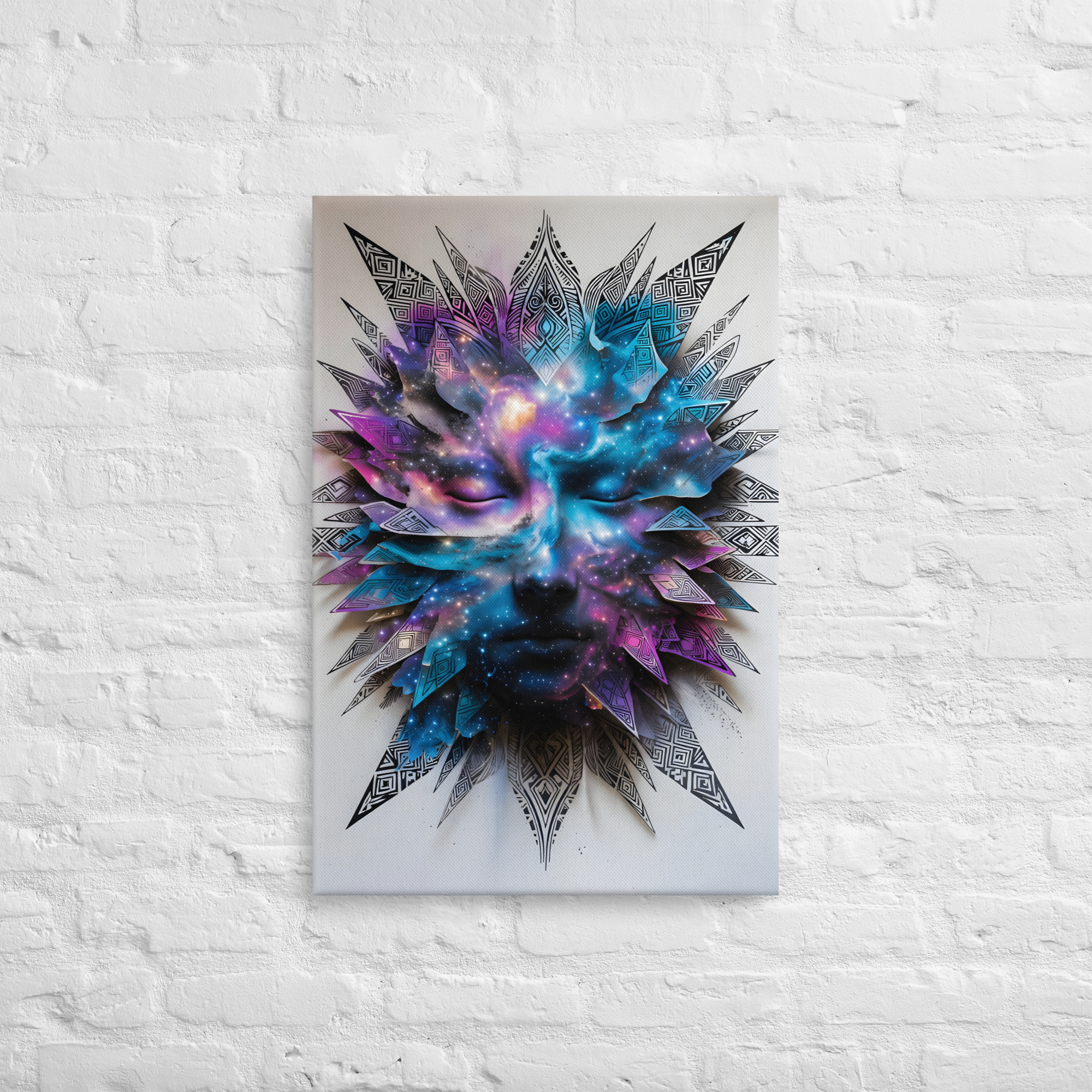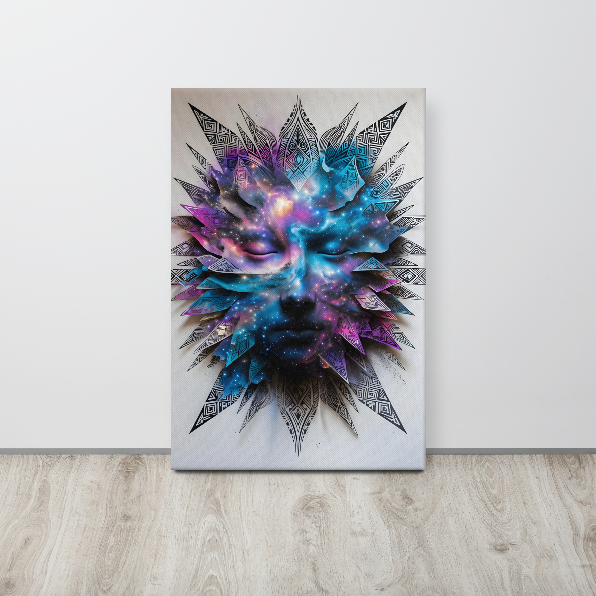 Awaken your space with this hypnotic Cosmic Tribal Face canvas print. A serene, closed-eye face dissolves into a swirling nebula of deep space purples, electric blues, and vibrant pinks, surrounded by intricate geometric tribal feathers and mandala-inspired patterns. This powerful fusion of spirituality, cosmic energy, and modern tribal design is perfect for meditation rooms, yoga studios, bedrooms, or anywhere you seek tranquillity and wonder. Printed on with stunning, fade-resistant inks on premium artist-grade canvas. Gallery-wrapped, ready to hang, available in 12×16, 16×20, or 20×30 inches.Key Features: