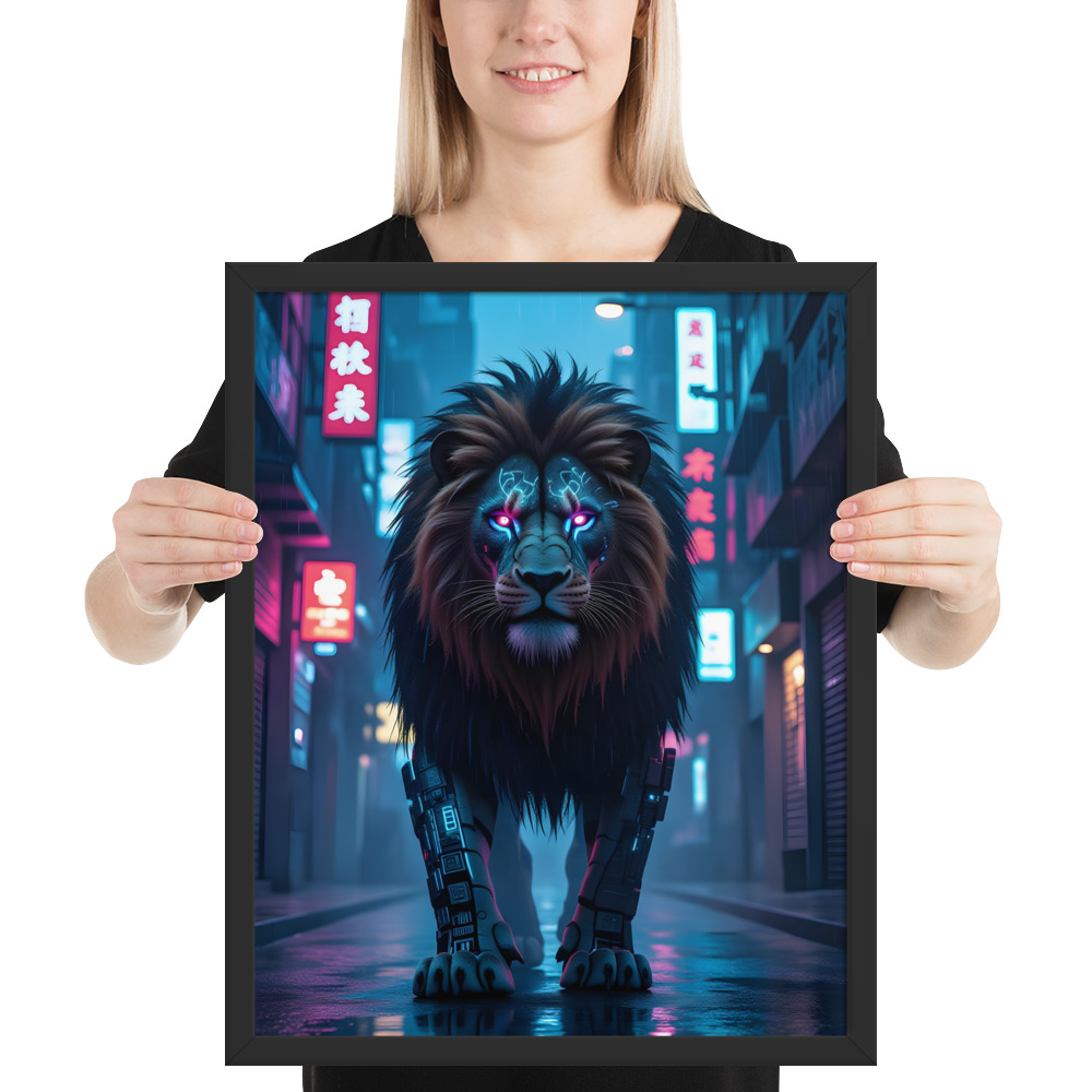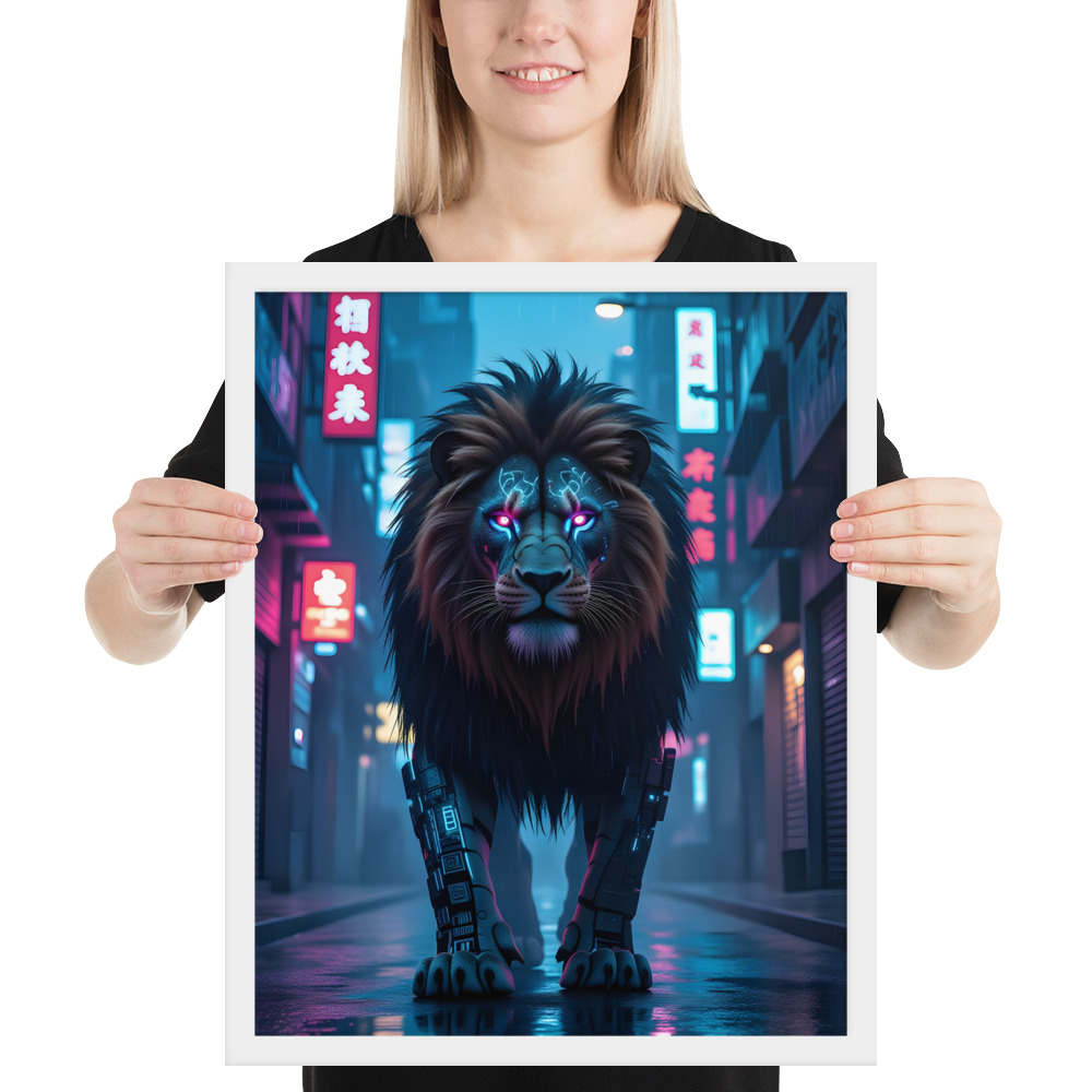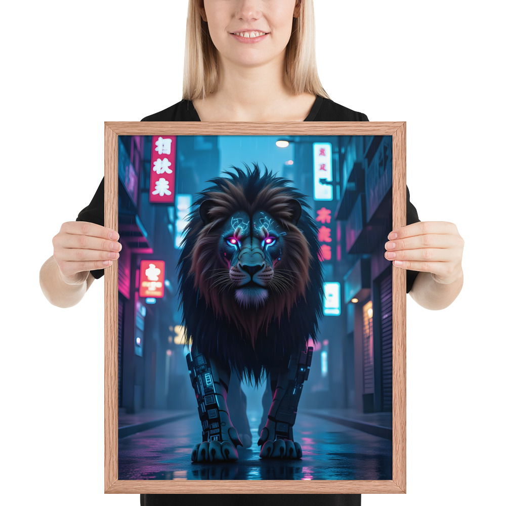 Unleash futuristic dominance with this electrifying Cyberpunk Lion Robot framed matte poster. A massive cybernetic lion with glowing neon-pink eyes and mechanical legs stalks through a rain-drenched, neon-soaked Asian cyberpunk street - pure Blade Runner meets king of the jungle. Perfect for sci-fi fans, gamers, modern lofts, offices, or any space craving high-impact futuristic art. Printed on premium enhanced matte paper with vivid neon colours and professionally framed in your choice of black, white, or natural oak wood frame. Available in 8×10, 11×14, 16×20, and 20×30 inches.Key Features: