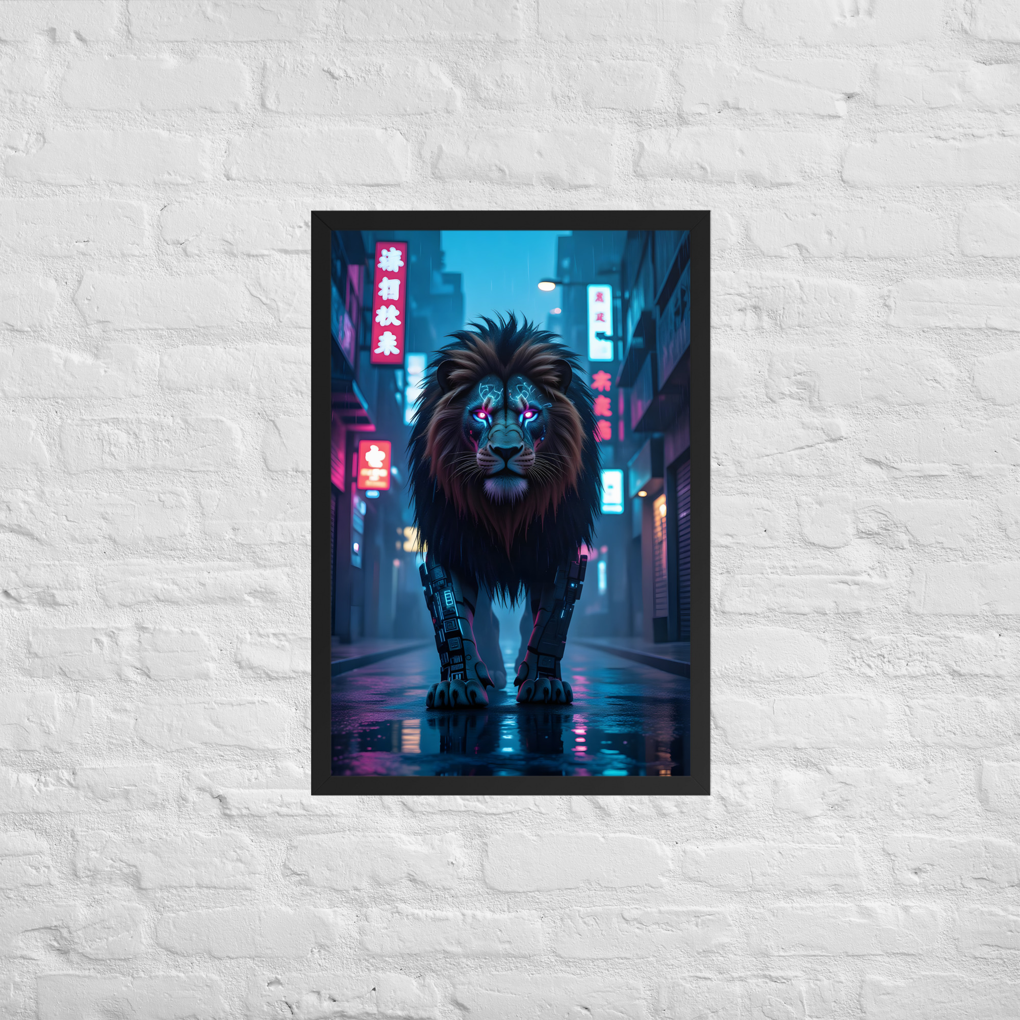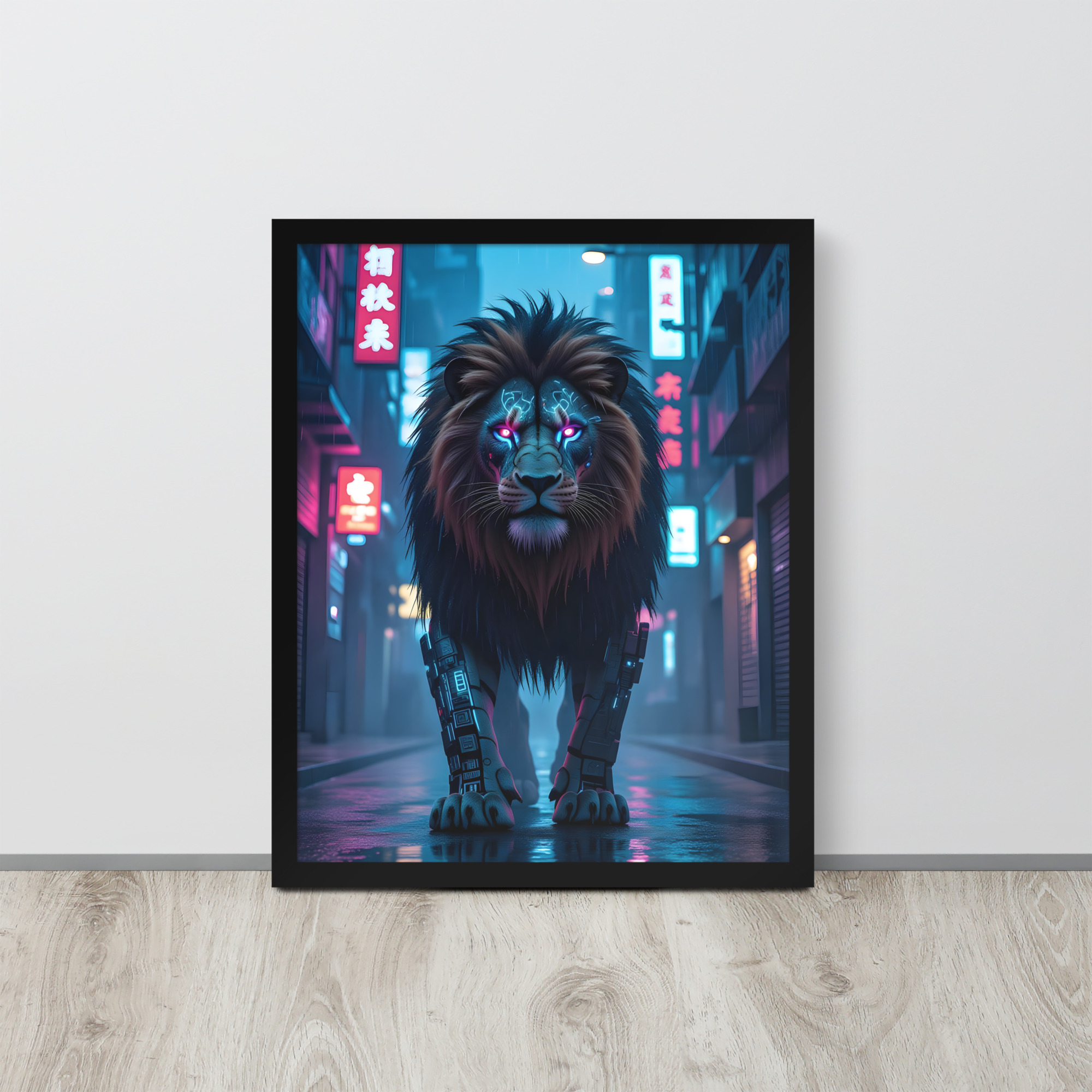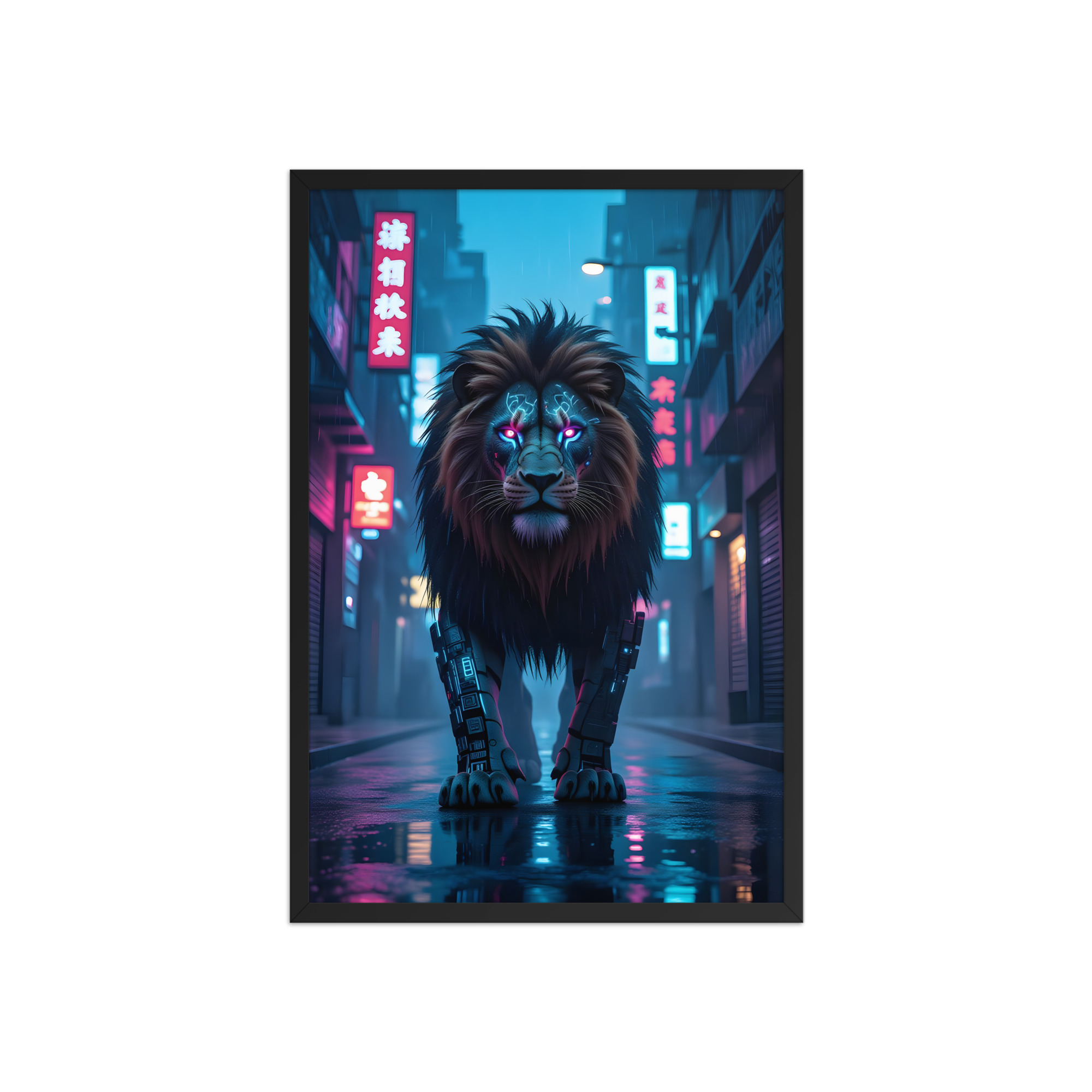 Unleash futuristic dominance with this electrifying Cyberpunk Lion Robot framed matte poster. A massive cybernetic lion with glowing neon-pink eyes and mechanical legs stalks through a rain-drenched, neon-soaked Asian cyberpunk street - pure Blade Runner meets king of the jungle. Perfect for sci-fi fans, gamers, modern lofts, offices, or any space craving high-impact futuristic art. Printed on premium enhanced matte paper with vivid neon colours and professionally framed in your choice of black, white, or natural oak wood frame. Available in 8×10, 11×14, 16×20, and 20×30 inches.Key Features: