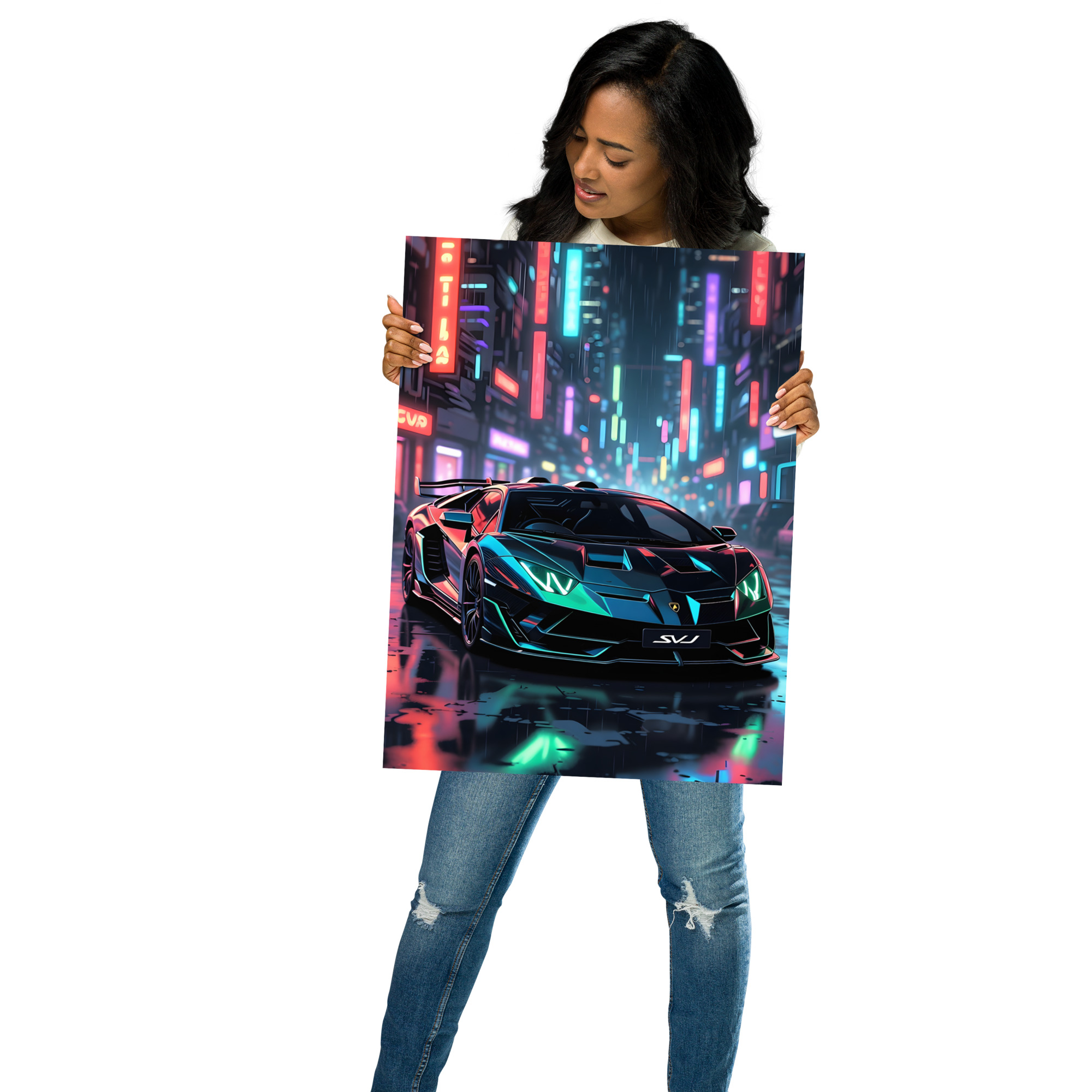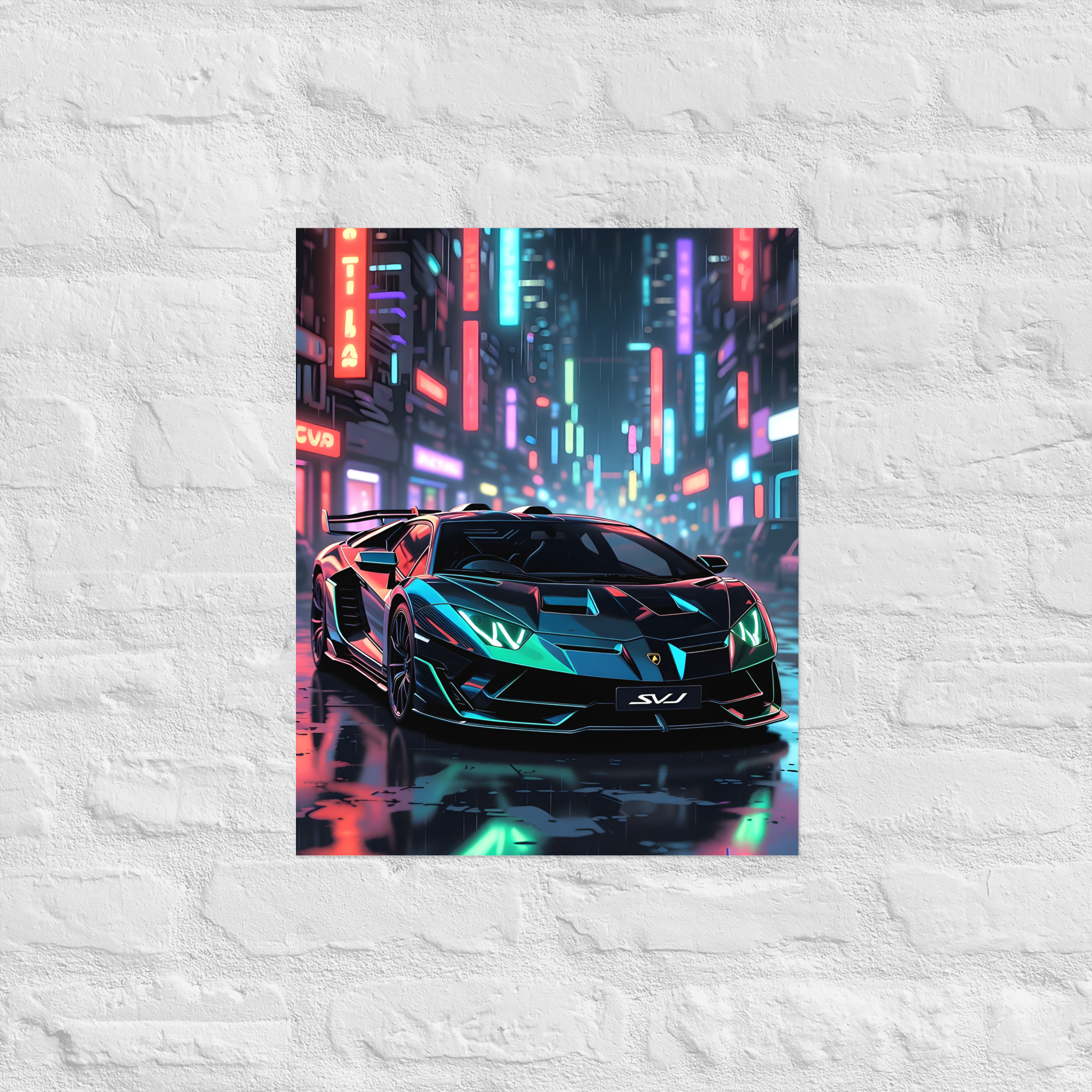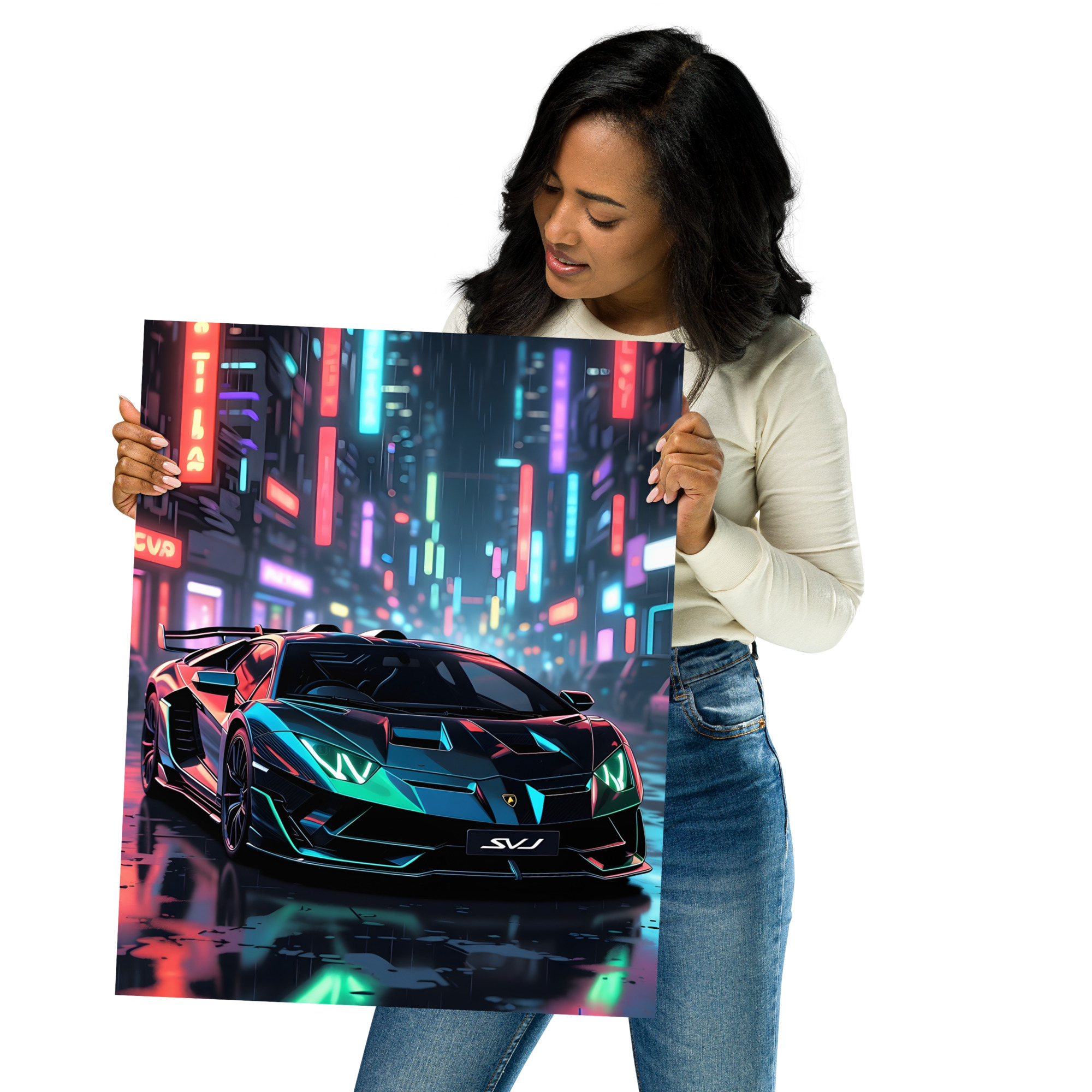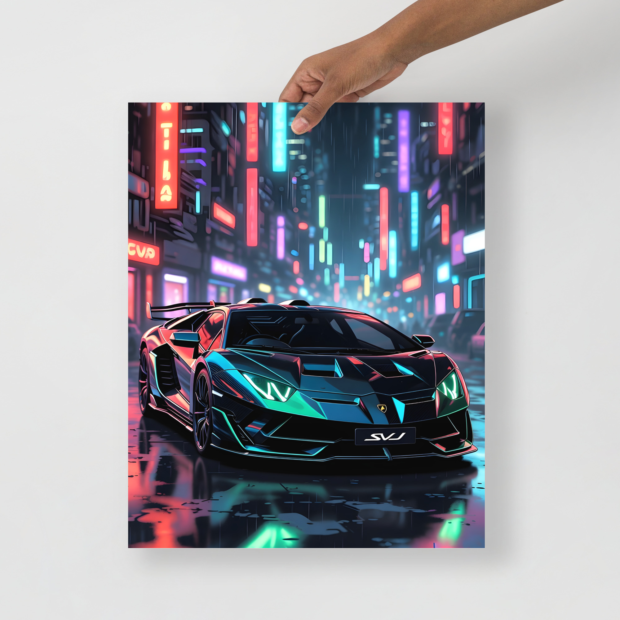 Rule the neon-soaked streets! This electrifying extreme wedge supercar neon Tokyo night front view matte poster captures a black-and-cyan angular beast prowling a rain-drenched futuristic Tokyo district, glowing headlights slicing through the darkness, massive rear wing dominating the skyline, and towering neon signs pulsing in pink, cyan, and red. Pure next-gen supercar aggression meets high-voltage cyberpunk energy - perfect for gaming rooms, luxury lofts, man caves, or any wall that lives for speed and neon dreams.Printed on premium Enhanced Matte Paper, every neon reflection, rain droplet, and razor edge is rendered with razor-sharp detail and a velvety, glare-free finish that makes the scene glow in any light.
