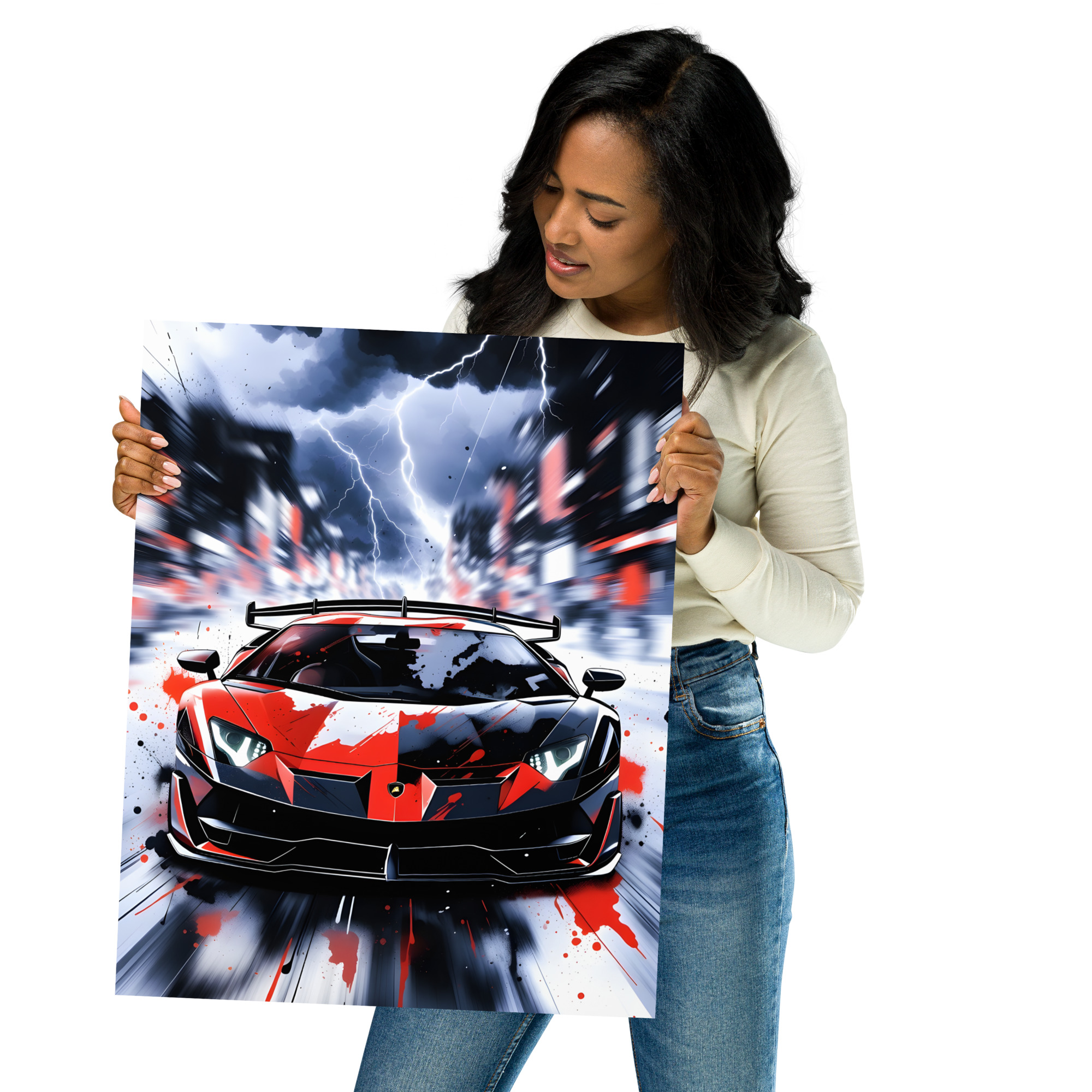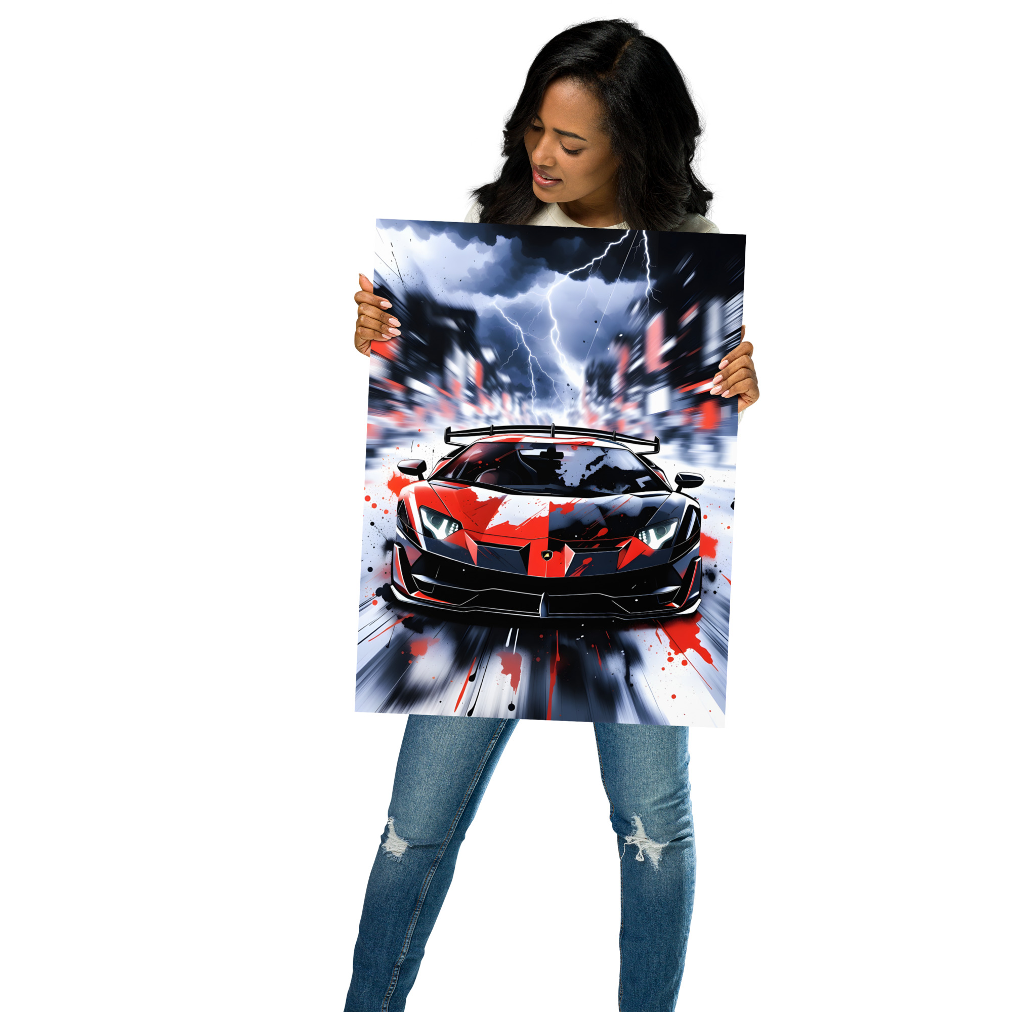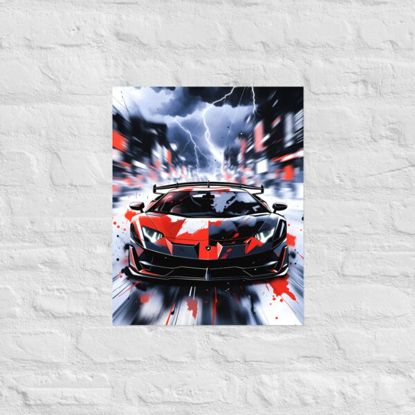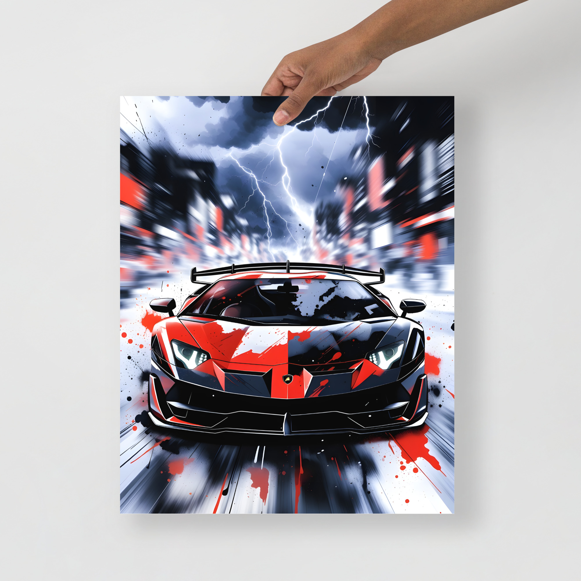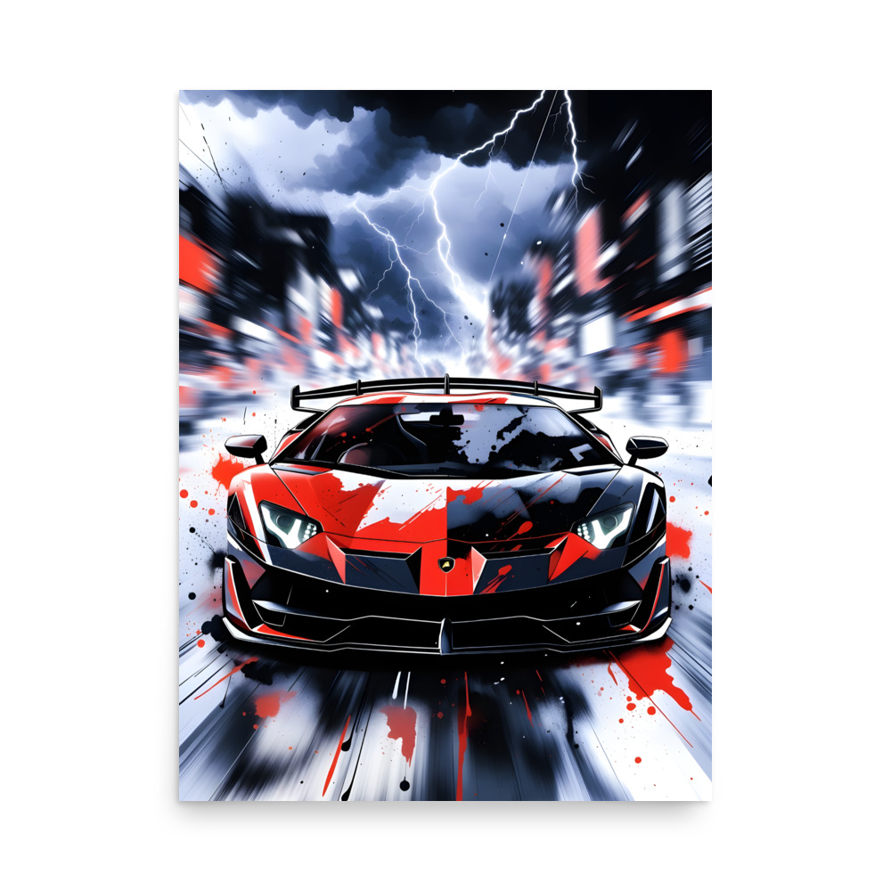 Ride the storm! This electrifying extreme wedge supercar storm lightning front view matte poster captures a red-and-black angular beast charging straight into a lightning-filled cyberpunk cityscape, paint splatters exploding across the body, headlights blazing, and massive rear wing cutting through the chaos. Pure apocalyptic supercar energy fused with high-octane street-art drama - perfect for gaming rooms, man caves, urban lofts, or any wall that lives for thunder, speed, and attitude.Printed on premium Enhanced Matte Paper, every lightning bolt, paint splash, and rain streak is rendered with razor-sharp detail and a velvety, glare-free finish that makes the scene crackle with intensity in any light.
