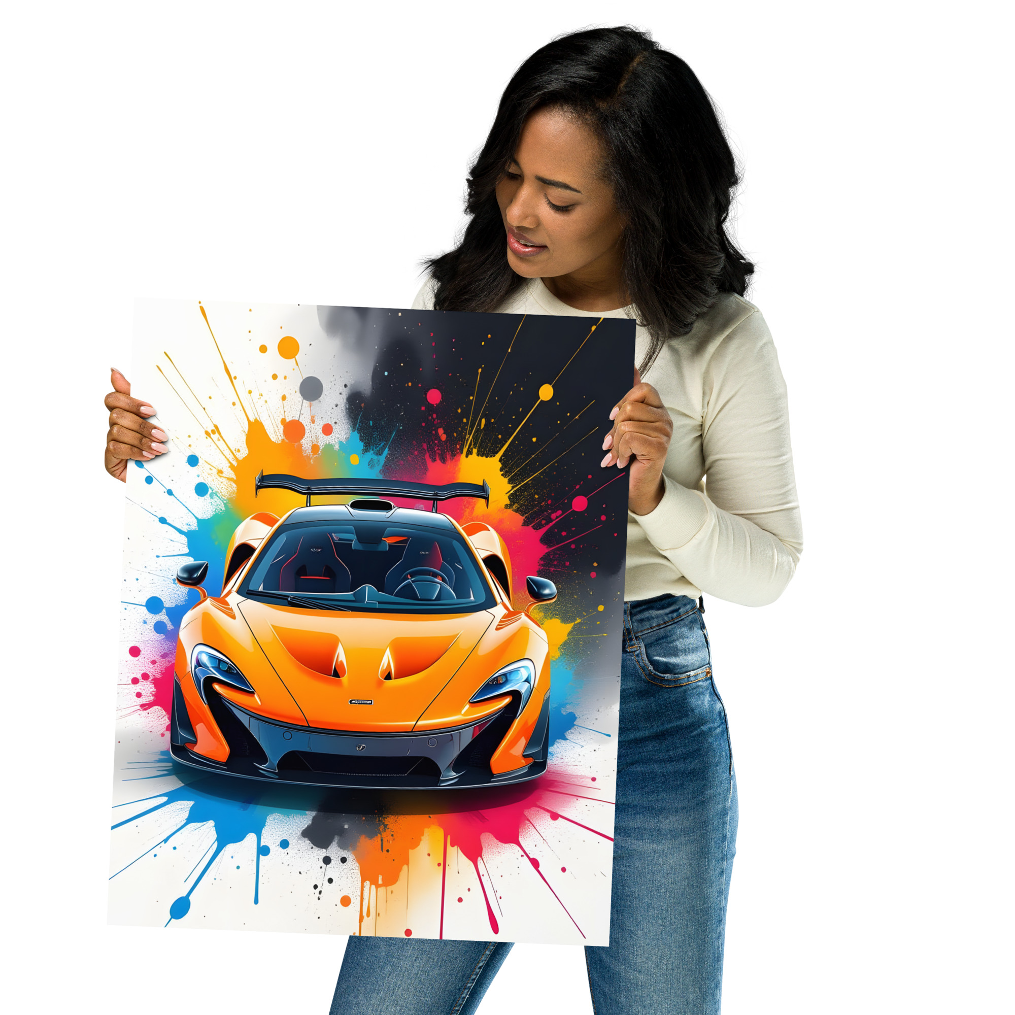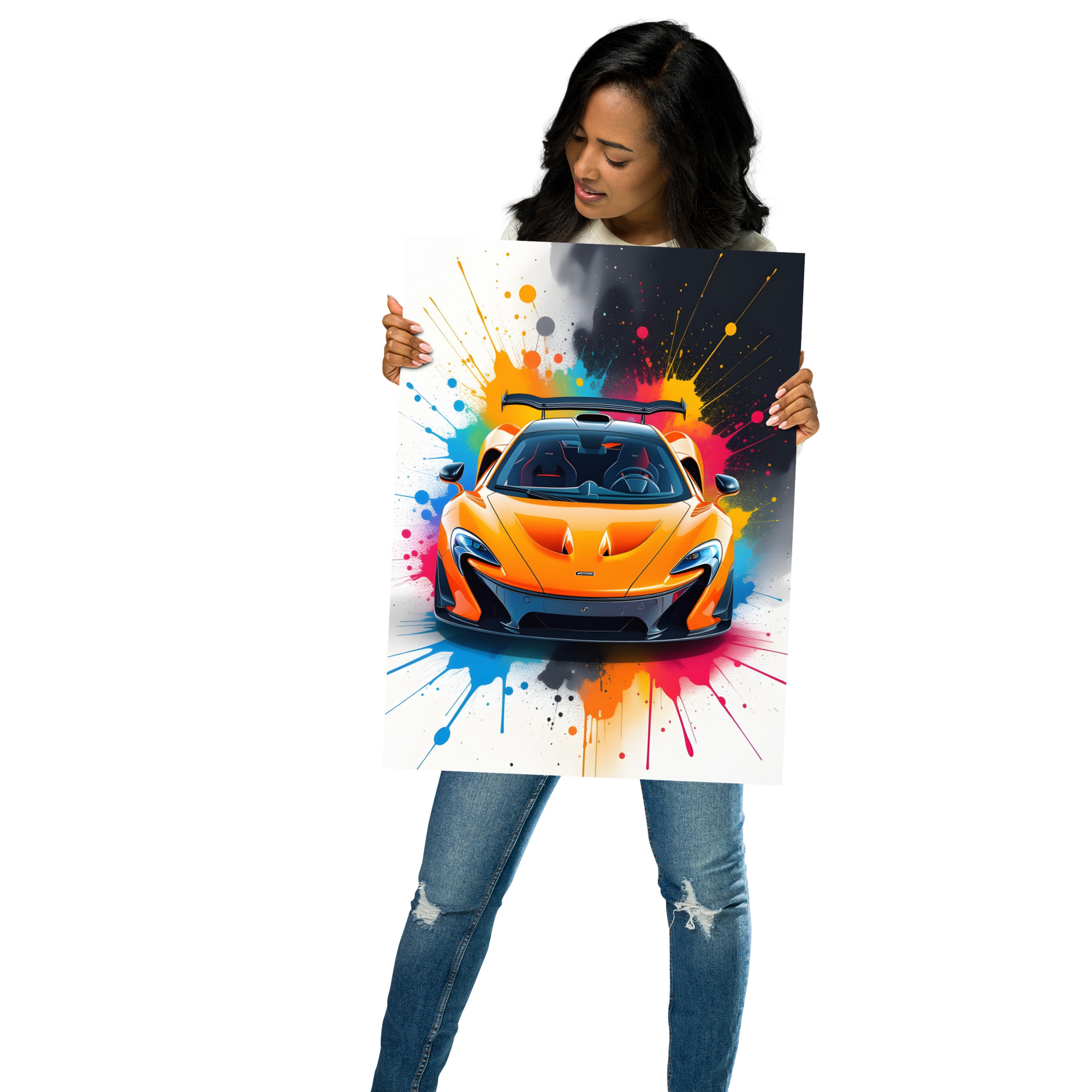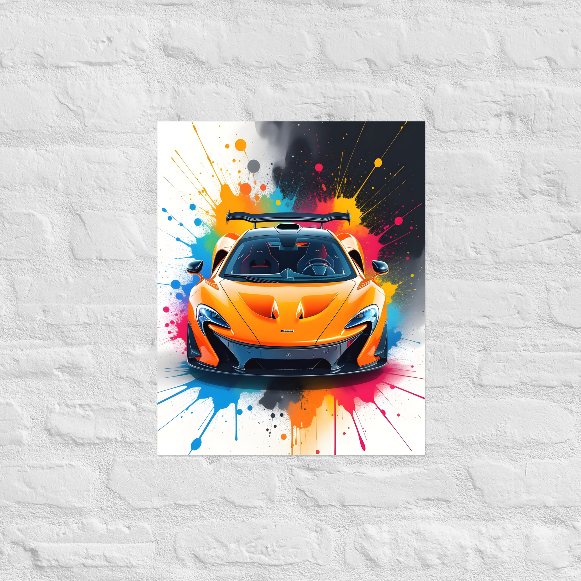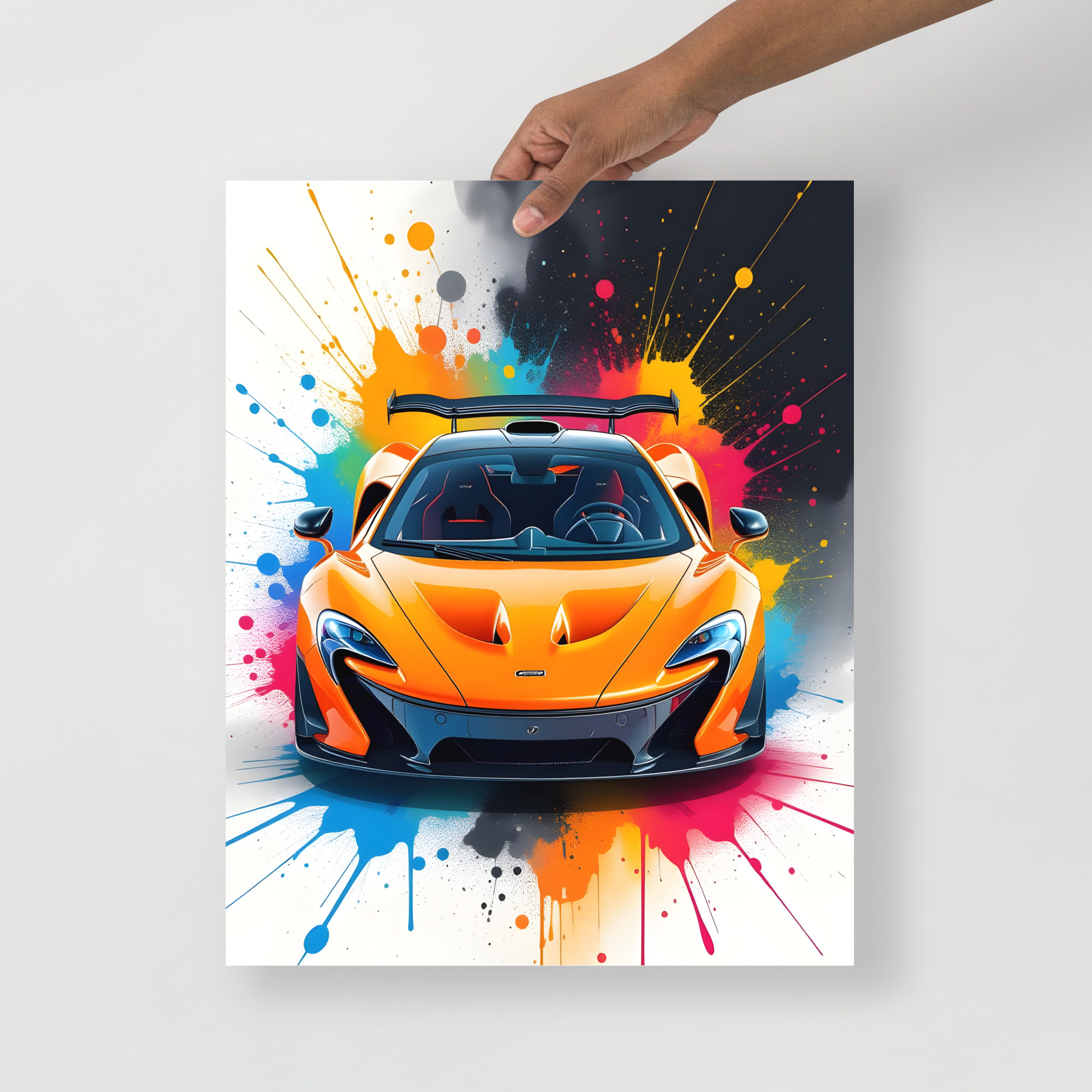 Electrify your walls with this volcanic front-view matte poster! A searing papaya orange hypercar storms forward with razor-sharp LED eyes, aggressive carbon splitter, and towering rear wing, all detonated by a psychedelic rainbow paint-splash supernova in cyan, magenta, yellow, and black that screams 903 hp hybrid fury. This digital artwork fuses elite engineering with explosive street-art adrenaline—perfect for garages, futuristic offices, or high-octane living spaces. Printed on premium Enhanced Matte Paper via Printful, it delivers blazing colour depth and a silky, glare-free finish that keeps every aerodynamic edge lethal in any light. Choose your domination size: 11"×14", 8"×10", 16"×20", 12"×18", 18"×24", A2 (16.5"×23.3"). Frame it carbon, float-mount it clean, or hang it raw—your circuit, your rules. Every print is crafted fresh on-demand with sustainable precision for flawless quality and zero waste. Worldwide shipping in 2-5 days drops 217 mph prestige at your door. The ultimate gift for hypercar fans or anyone who demands the pinnacle of performance art. Note: This is a print-on-demand product fulfilled by Printful.Age restrictions: For adults