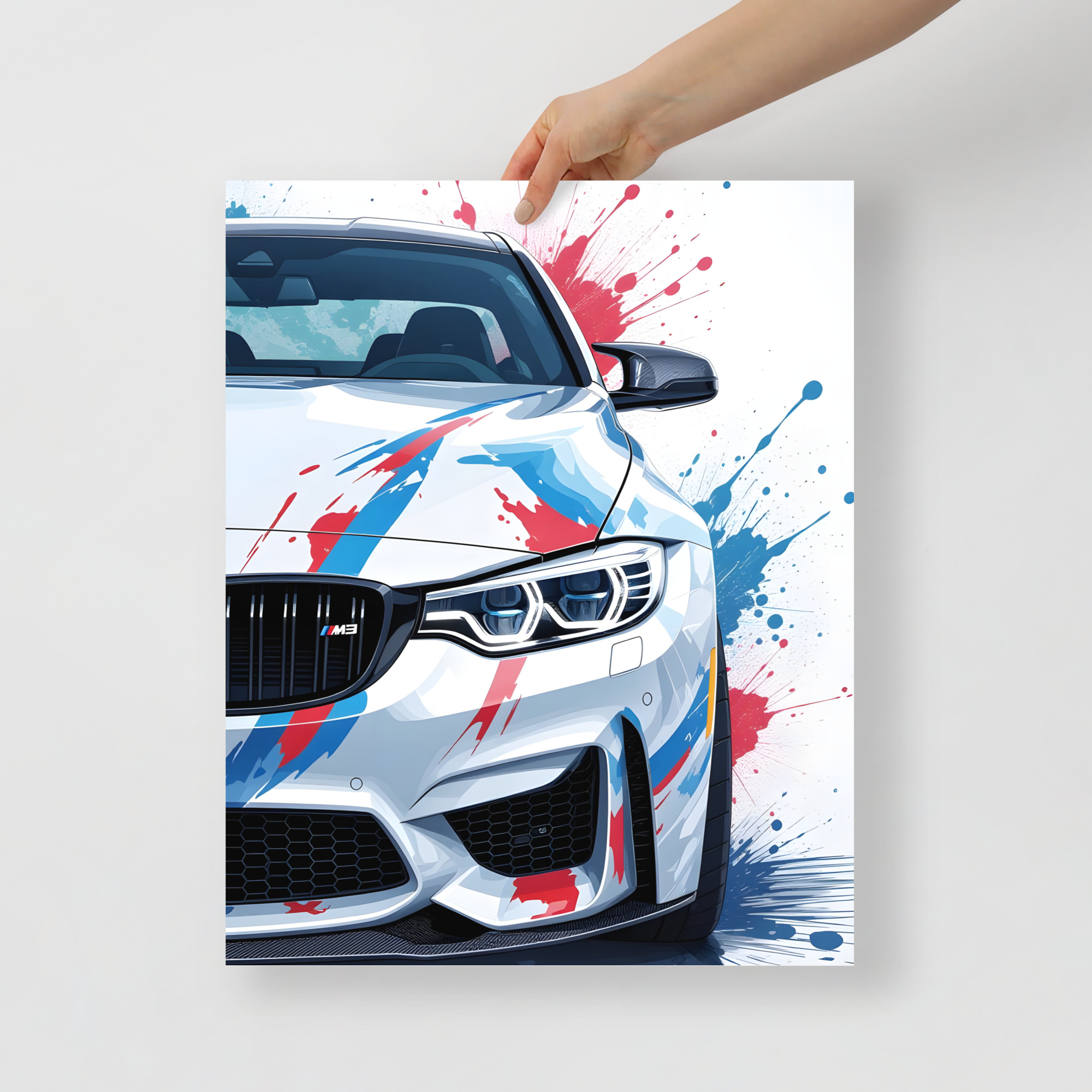 Dominate your decor with this adrenaline-charged modern performance sedan front view matte poster! The pristine white machine snarls forward with signature aggressive grille, halo-style headlights, and carbon accents, all electrified by dynamic red, blue, and cyan paint splashes streaking across the body and exploding into the background. This original artwork fuses motorsport heritage with high-energy street art, delivering a visual rush that turns heads in any room. Printed on premium Enhanced Matte Paper for stunning colour depth and a smooth, non-glare surface-ideal for bright spaces, man caves, or professional offices.